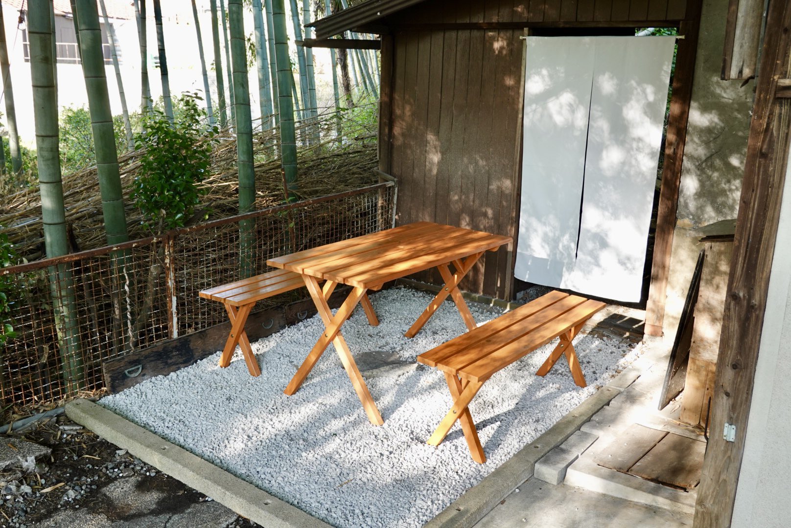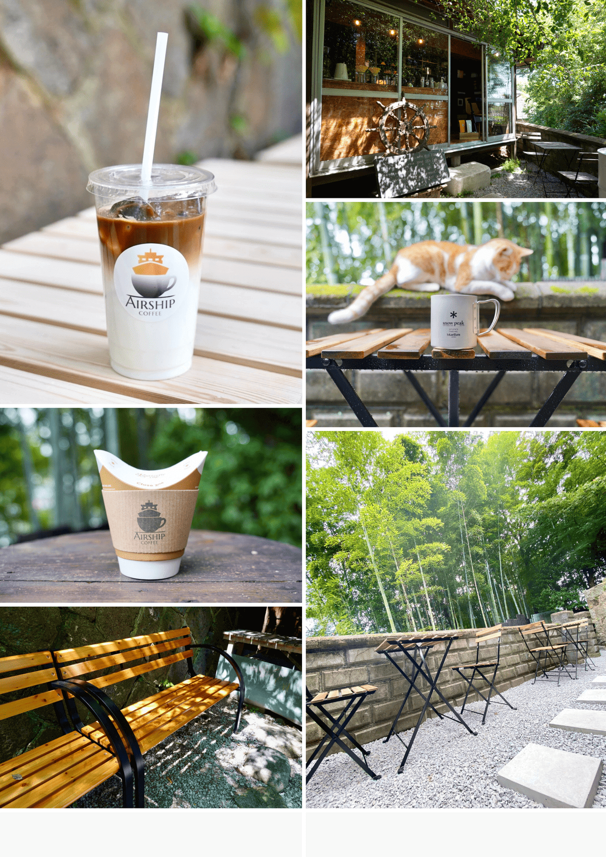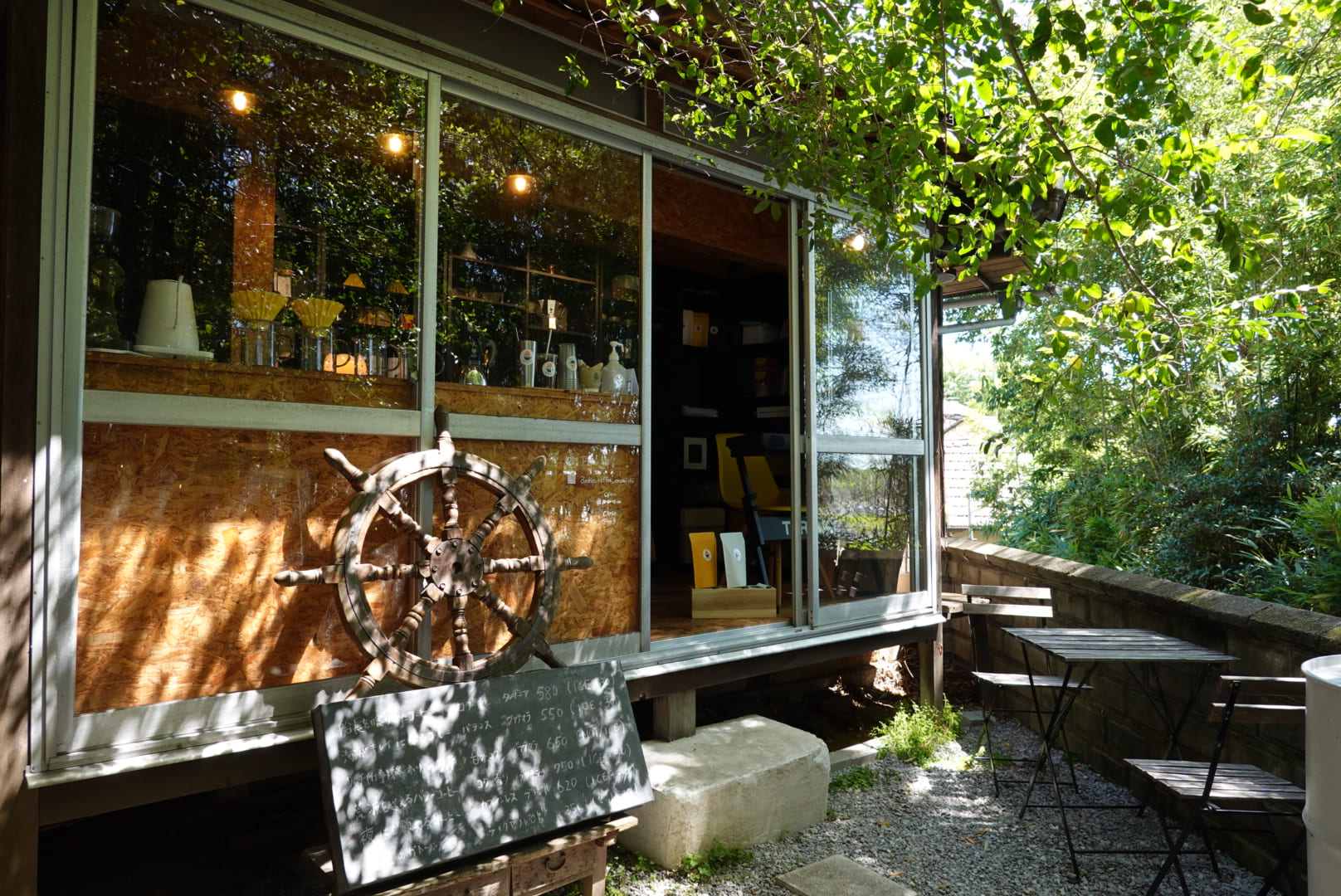 舵や空き家にあった貝がらなどで船・海らしさを演出。テラス席では、視界いっぱいに広がる竹林と、鳥のさえずり、笹の葉擦れ音、香り高いコーヒーの余韻に思わずため息が漏れてしまう。